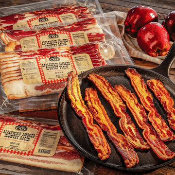 **Applewood Bacon, Maplewood Bacon, Hickory Bacon, Peppered Bacon, Smoked Sausage, and Country Ham are USDA-approved shelf-stable products, good out of refrigeration for up to 7 days. Meat products should be refrigerated or frozen upon arrival. Can be stored in the refrigerator for up to 6 months and 12 months in the freezer.**